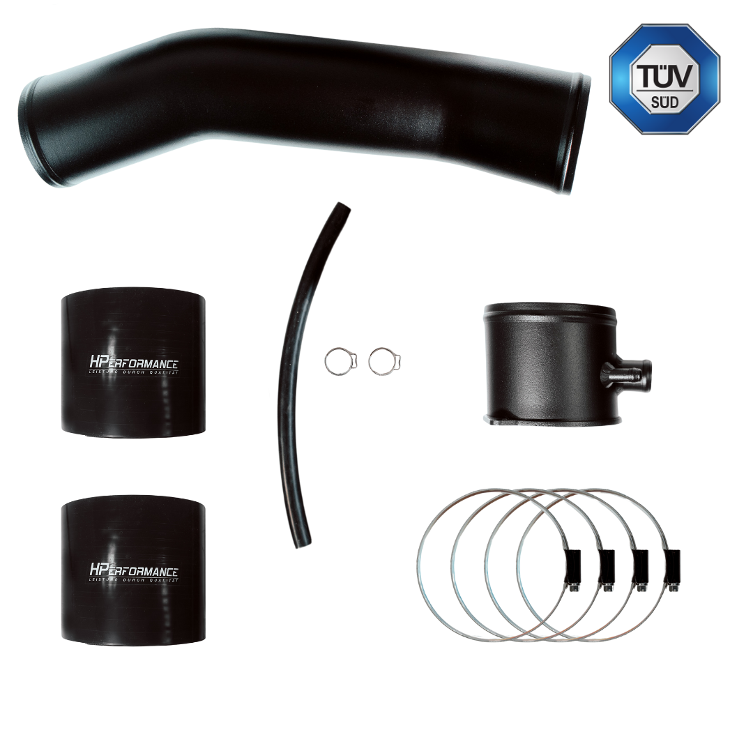 Die geschlossene HPerformance  4" 100mm Ansaugsystem ist endlich da. Es kann zusammen mit der originalen Air-Box gefahren werden. Diese Variante kann direkt auf das originale Turboinlet  Mehr Ansaugluft ohne laute Ansauggeräusche wie bei einer offenen Ansaugung. Unser OEM+ Ansaugsystem steigert die sichtbare Leistung gegenüber dem Serienansaugsystem und sollte in jedem Fahrzeug mit mehr als 490PS verwendet werden. Das Carbon Rohr haben wir an den Enden mit Aluminium verstärkt, um ein Brechen beim Anziehen der Schellen zu verhindern. Lackiert ist das ganze mit einem Hitzebeständigen Speziallack.