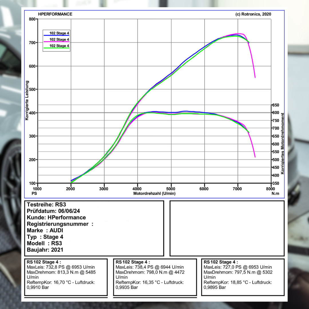 Unsere 16 Jahre Erfahrung im Audi 5 Zylinder Tuning und monatelange Entwicklungsarbeit haben sich ausgezahlt - die stärkste Tuningstufe für Ihren Audi RS3 8V, TTRS 8S oder RSQ3 F3. Grundlage für diese Leistungsstufe ist eine Motorverstärkung mit unserem Engine Pack 1, welches gleichzeitig durch unsere neuen HP Spezialpleuelstangen auch die Verdichtung des Motors reduziert. Dies macht den Motor nicht nur haltbarer, es verbessert auch die Leistungsausbeute auf Tankstellenbenzin, da die Verbrennung kontrollierter wird.