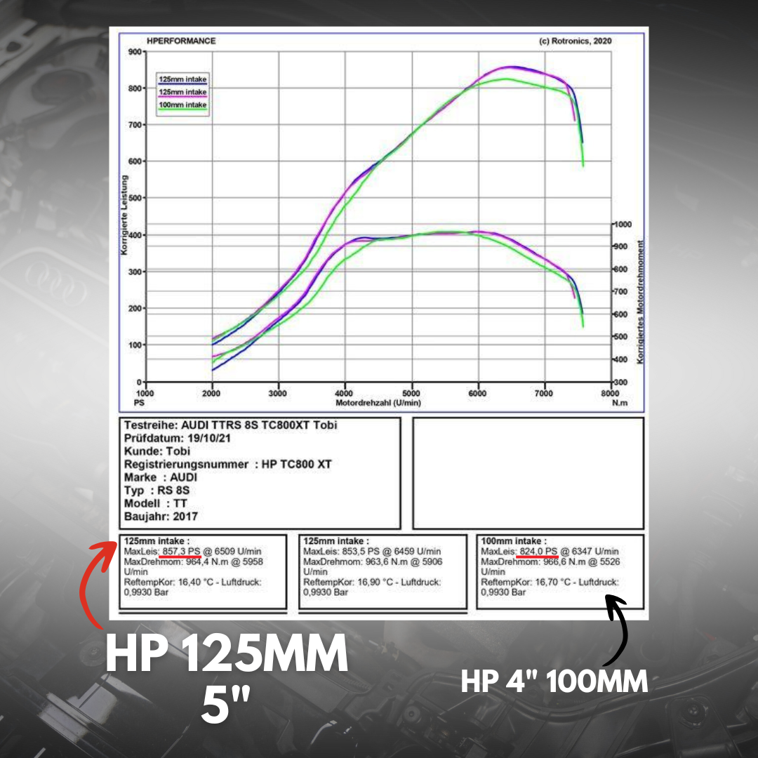 Das offene HPerformance 5" 125mm Ansaugsystem ist eines der größten Ansaugsysteme auf dem Markt. Mit dabei ist ein 100mm 4" Oversize Turbo Inlet, das mit einem Silikonreduzierer an das Ansaugrohr selbst angepasst wird. Das 125mm 5-Zoll-Ansaugsystem steigert die sichtbare Leistung gegenüber einem 100mm 4 Zoll Ansaugsystem und sollte in jedem Fahrzeug mit mehr als 650PS verwendet werden. Das System verfügt über eine gut gestaltete Halterung, um jegliche Berührung im Motorraum zu verhindern. Durch die Verwendung von Aluminium hat es einen guten Wärmeaustausch und ist sehr leicht. Es hat keine negativen Nebenwirkungen/Risikoeffekte wie Kohlenstoffsysteme in Bezug auf Schmelzen, Ausbleichen/Bleichen oder Verformung. Darüberhinaus hat Aluminium sehr gute Wärmeaustauschfunktionen, sodass ein heißes Ansaugrohr nach abgestelltem Motor extrem schnell wieder kalt wird. Es speichert keine Wärme.