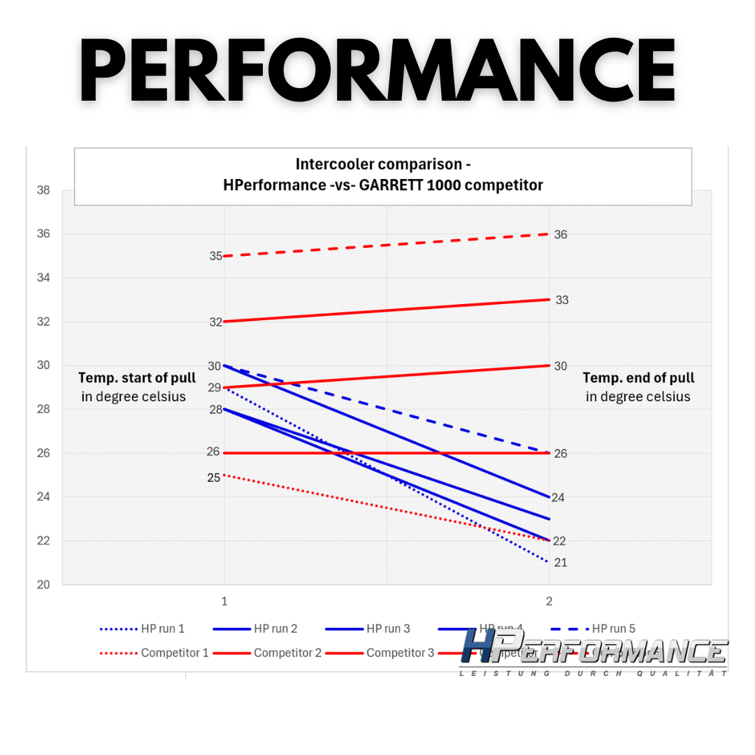 Um das enorme Potential des Kühlers besser einschätzen zu können, haben wir diesen im direkten Wettbewerbsvergleich mit einem GARRETT 1000 Ladeluftkühler verglichen. Dabei konnte unser Sport Serie Ladeluftkühler sein Potenzial ausspielen. Selbst nach 5 Läufen auf dem Prüfstand lag die Ausgangstemperatur (nach der Beschleunigung) noch immer unter der Eingangstemperatur (vor der Messung). Diesen Effekt konnten wir auf der Straße noch deutlicher nachweisen. Die Messergebnisse hierzu können den Bildern entnommen werden.