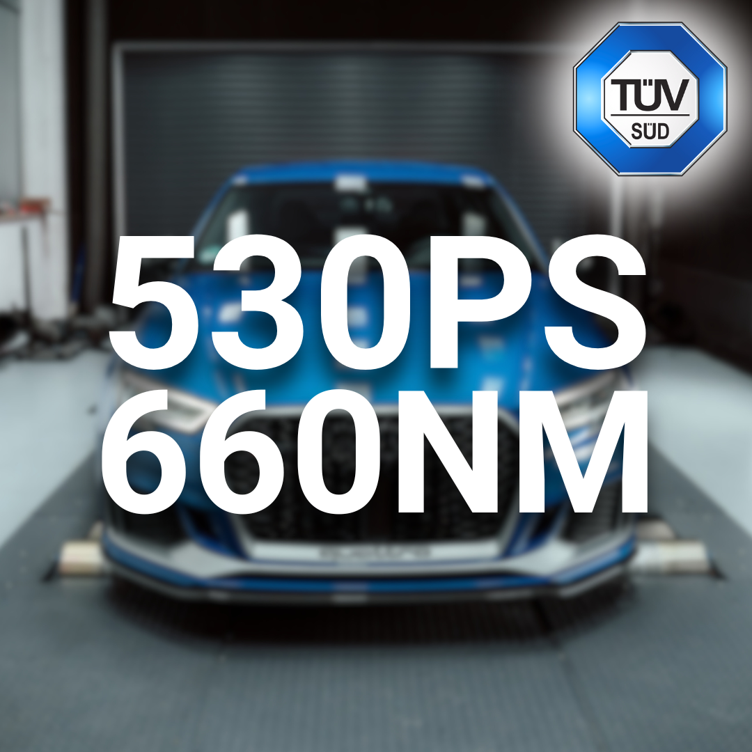 Die HPerformance Stage 2 ist die konsequente Weiterentwicklung der Stage 1+ und bringt das Setup auf ein neues Leistungsniveau. Kernstück ist die 90 mm TÜV-konforme Downpipe mit integrierten Unterflurkatalysatoren, die nicht nur den Abgasgegendruck reduziert und das Thermokonzept verbessert, sondern auch den charakteristischen 5-Zylinder-Sound noch intensiver zur Geltung bringt.