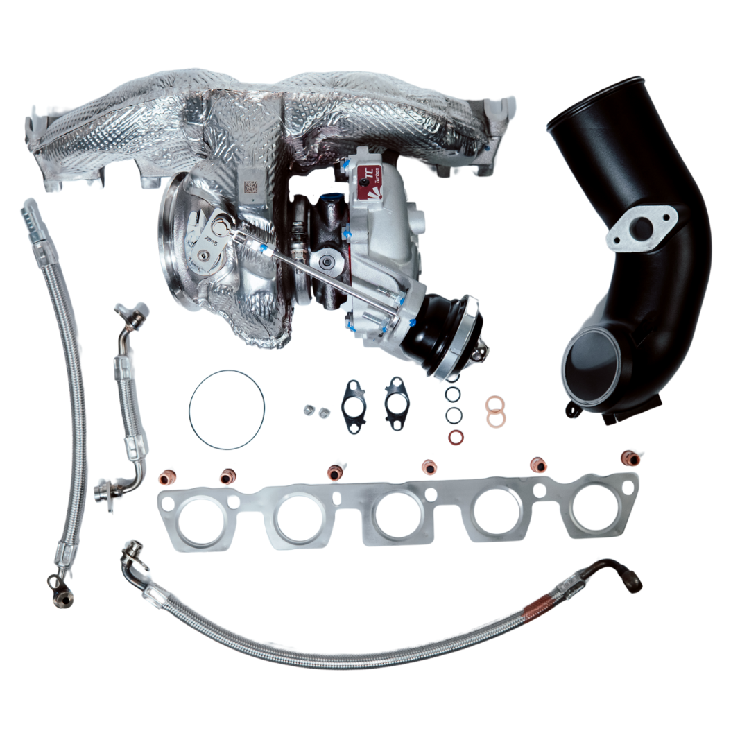 Front charge air cooler (HP Sport series), turbo inlet (min. 100mm), intake system (min. 125mm), downpipe (102mm), engine reinforcement (Engine Pack 1), 1000cc injectors, mechanical blow-off valve (HP blow-off pipe), NGK R7 series spark plugs, exhaust system from catalytic converter, passenger-side boost pressure pipe, 4 bar pressure sensors.