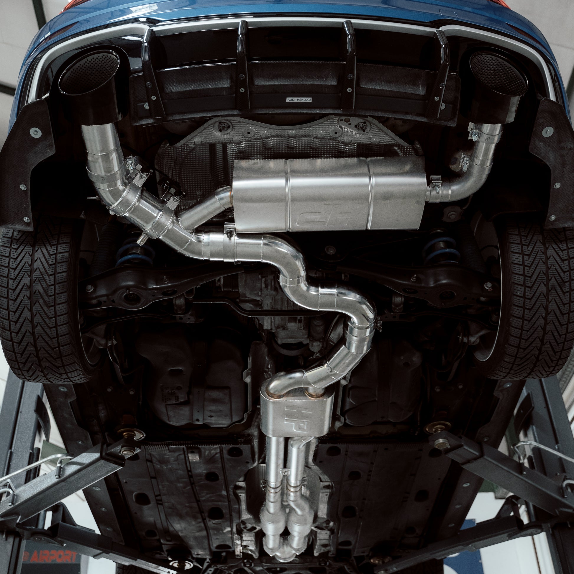 The HPerformance 4 inch - 101.6mm exhaust system is not only designed to achieve an unprecedented sound on the 2.5 TFSI, but also to reproduce every technically possible performance from the point of view of exhaust back pressure. This system can easily cope with any feasible power output, even well over 1000 hp, without hissing as a result of possible exhaust pressure blockage. There is a balance between exhaust back pressure and actual possible power. Above a certain output (from 650 hp with the original exhaust system), the exhaust back pressure increases and the efficiency or power output decreases in equal measure - but not with our 101.6 mm exhaust system.