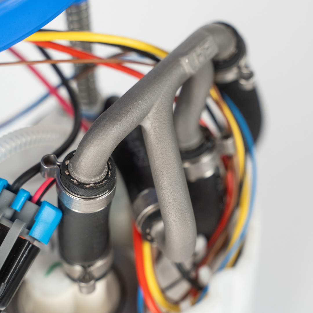 The HPerformance 1300HP+ Twin-Line low-pressure fuel pump is based on a brand new AUDI pump. In addition, a secondary brushless pump is combined with the system. This secondary pump is activated by a pressure switch via boost pressure and can be set to start at any boost level between 1 and 3.5 bar / 17 and 50 PSI. This helps to keep the fuel temperature low as the pump does not have to pump the fuel into the circuit when it is not needed. The maximum fuel pressure is 8 bar / 136 PSI to protect injectors and seals. The pump can pump gasoline as well as alcohol or methanol blended fuels. The pump is supplied with a fully plug-and-play wiring harness to fit your TTRS / RS3. The scope of delivery also includes installation instructions (download).