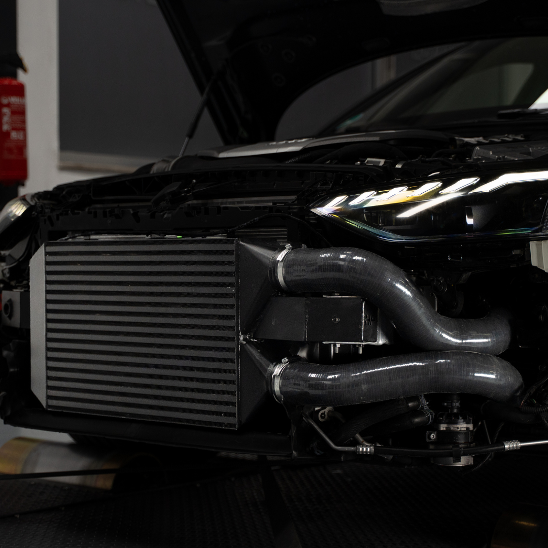 We were the first manufacturer in the world to overcome one of the model series' biggest weaknesses and create a unique product for this platform. The RS4 and RS5 2.9 Biturbo model range has a water-to-air supercharger system as standard. This is very efficient for a certain power range, but as soon as the power is increased, the system becomes unbalanced and the water acts as a heat accumulator. The higher the power and thus the boost pressure / air volume increases and the longer the vehicle is driven on the highway or generally under full load, the worse the cooling performance becomes. The intake air temperature rises, the vehicle becomes greasy and performance drops rapidly.