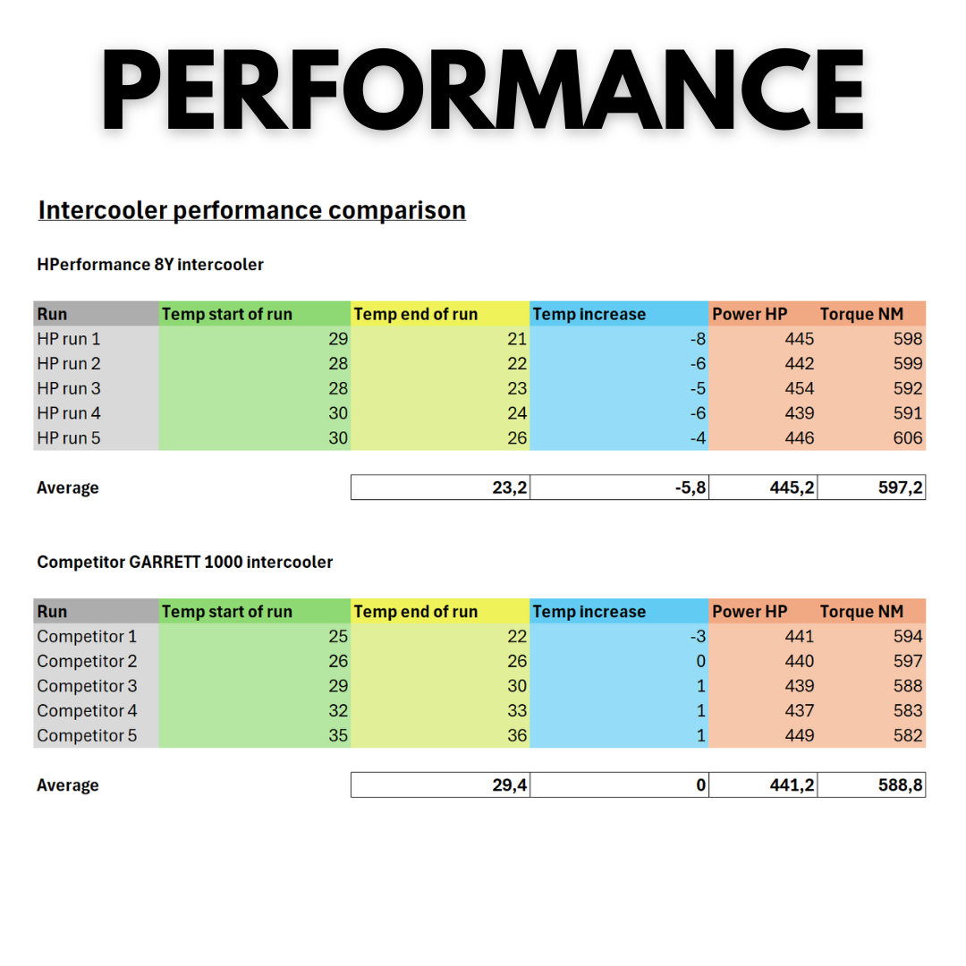 In order to better assess the enormous potential of the cooler, we compared it directly with a GARRETT 1000 intercooler. Our Sport Series intercooler was able to show its full potential. Even after 5 runs on the test bench, the output temperature (after acceleration) was still below the input temperature (before the measurement). We were able to demonstrate this effect even more clearly on the road. The measurement results can be seen in the pictures.