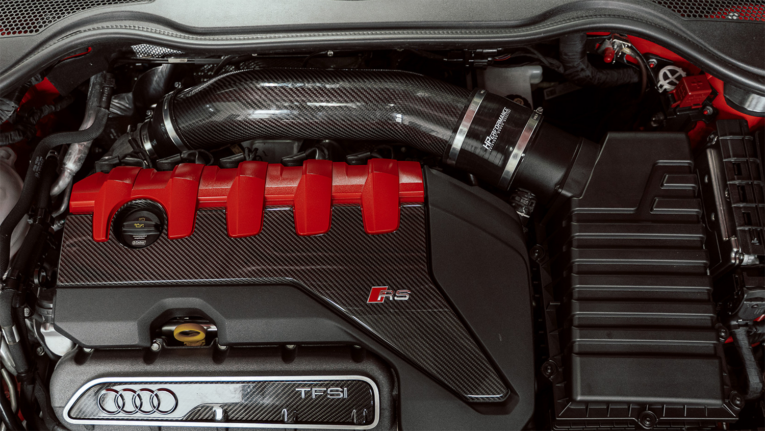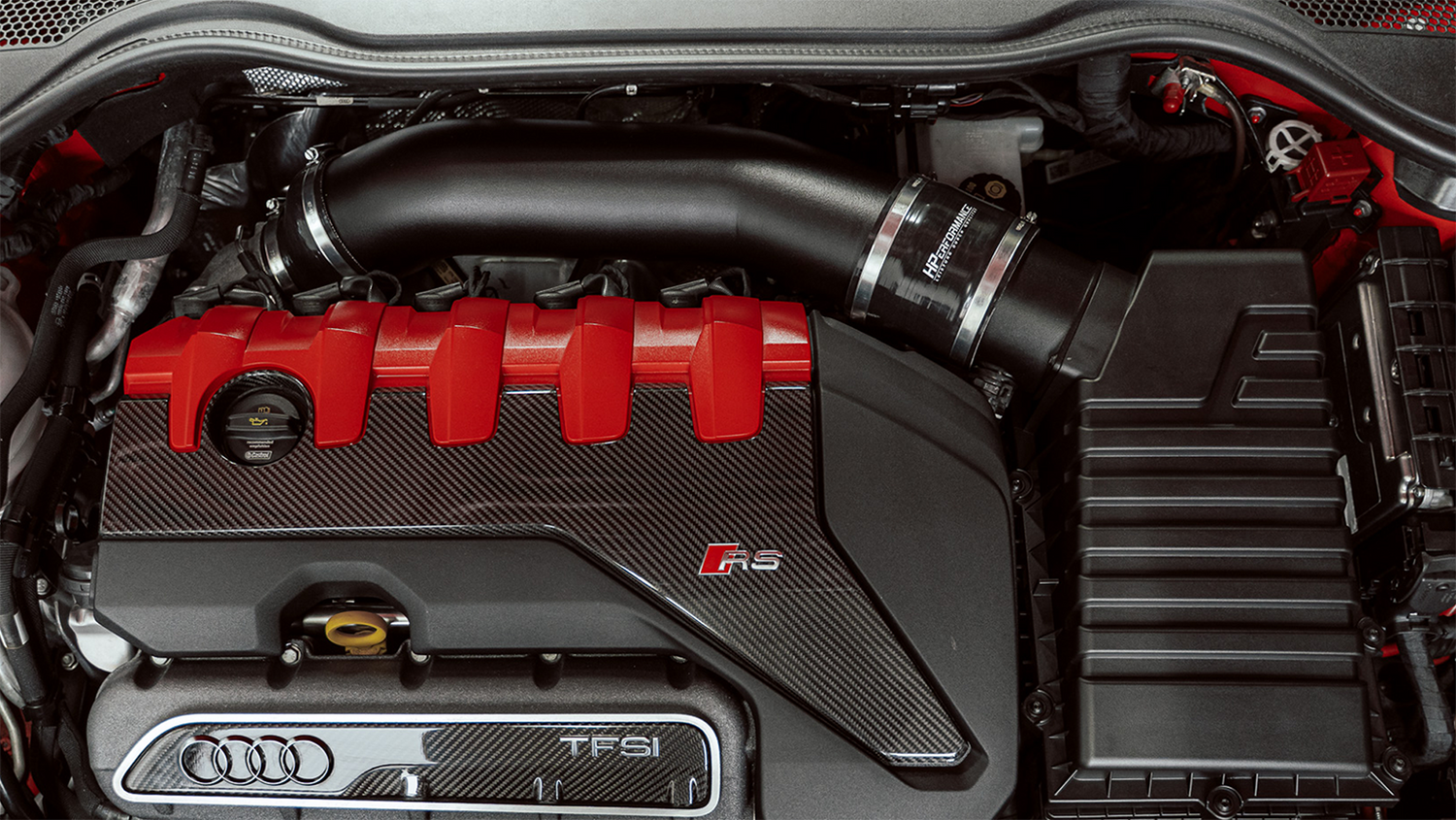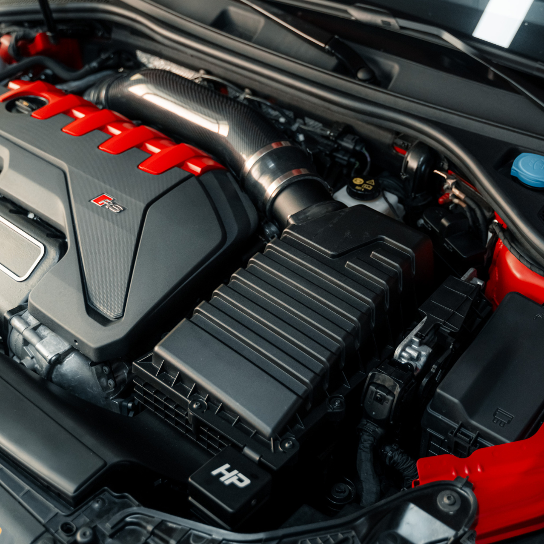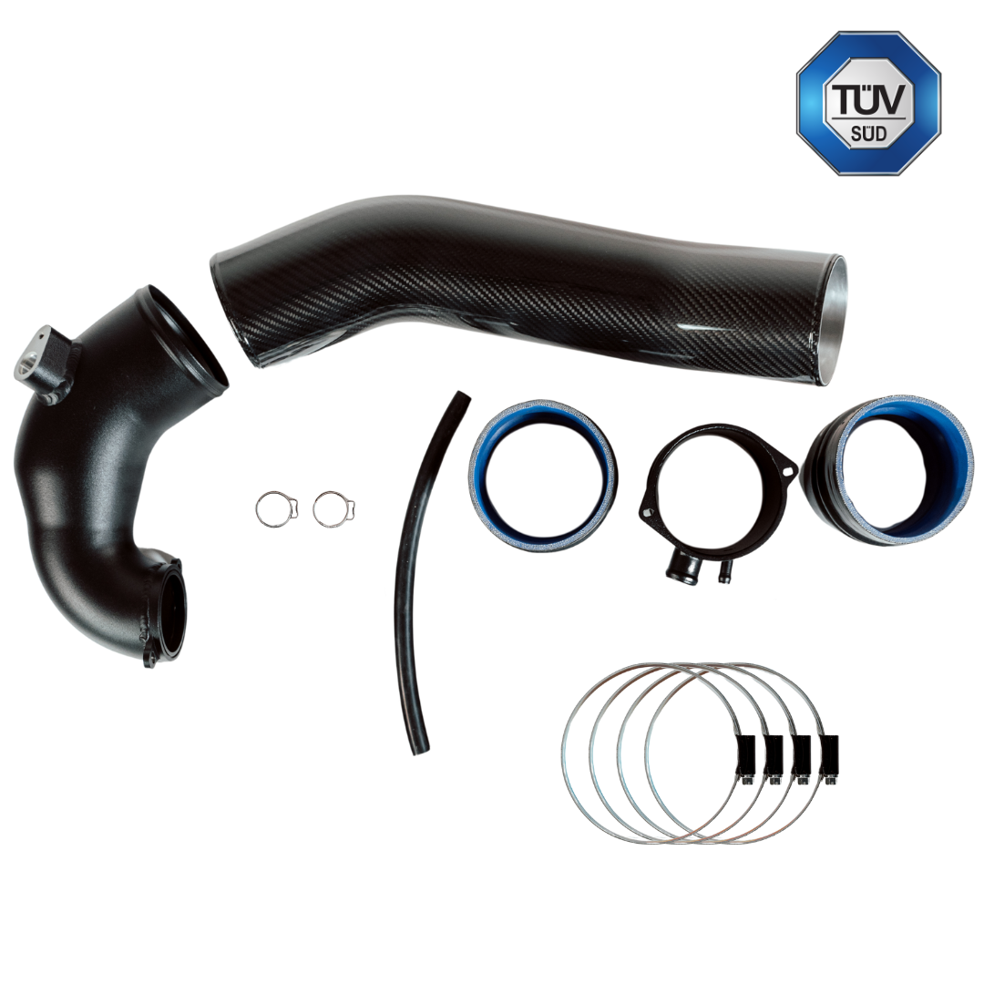 The closed HPerformance 4" 100mm intake system is finally here. It can be used together with the original air box. More intake air without the intake noise of an open intake. Also included is our 100mm 4" oversize turbo inlet, which is equipped with a Silicone hose connection is adapted to the intake manifold itself. Our OEM+ intake system increases the visible performance compared to the stock intake system and should be used in any vehicle with more than 490hp. We have reinforced the carbon tube with aluminum at the ends to prevent breakage when tightening the clamps. The whole thing is painted with a special heat-resistant paint.