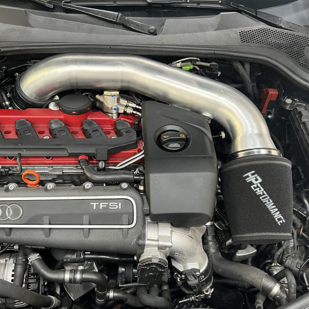 The HPerformance 100mm 4" open intake system is one of the largest intake systems on the market. It has a continuous 100mm pipe diameter, which is adapted to the turbo inlet itself with a silicone reducer. The 100mm 4 inch intake system increases visible power over a 90mm 3.5 inch intake system and should be used in any vehicle over 500hp/600NM. The system has a well designed bracket to prevent any contact in the engine bay. By using aluminum it has a good heat exchange and is very light. It has no negative side/risk effects such as carbon systems in terms of melting, fading/bleaching and deformation. In addition, aluminum has very good heat exchange functions, so that a hot intake manifold becomes cold again extremely quickly after the engine is switched off. It does not store heat.