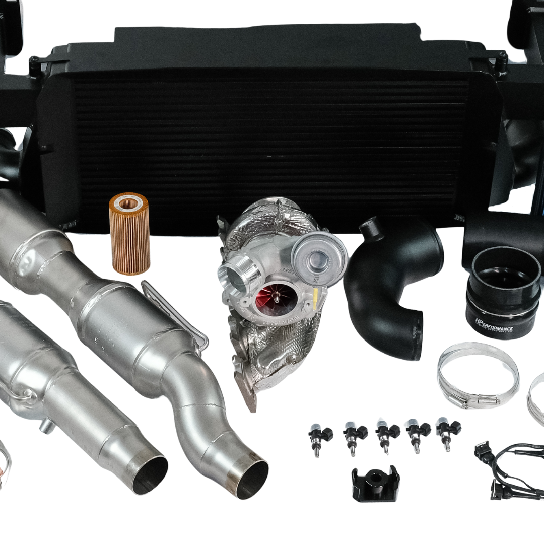Auf der Abgasseite reduziert die HP 4" (101,6 mm) OPF-TÜV-Downpipe den Abgasgegendruck, verbessert die Thermik und verleiht dem Fahrzeug einen emotionaleren Klang – voll TÜV-konform. Stufe 3 steht für linearen Schub bis oben hinaus – spürbar, präzise und kompromisslos.