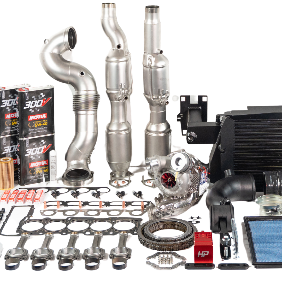 The exhaust side is realized via the powerful HP 4" downpipe with underfloor catalysts – optionally with 100- or 400-cell catalysts for maximum efficiency and rich sound.