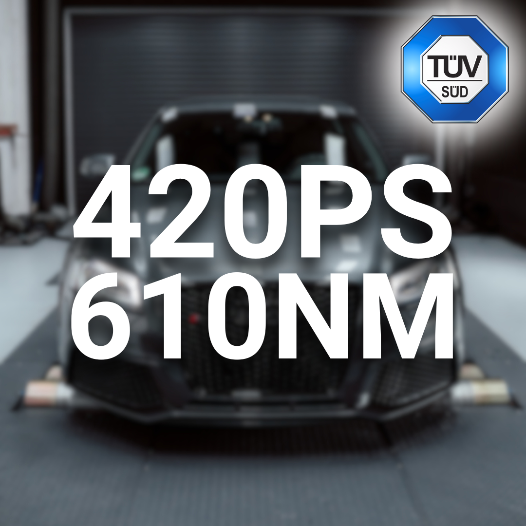 Experience the next evolutionary stage of the legendary 2.5 TFSI engine: With our Stage 1+ performance upgrade, we unleash 420 hp and 610 Nm of torque - TÜV-certified, of course. We optimize boost pressure, ignition timing and shifting behavior by precisely adapting the engine and transmission control. The result: noticeably improved acceleration, a more intense sound and a more dynamic driving experience. The V-max boost and modified flap control ensure an even sportier driving experience. This optimization remains in line with the factory safety parameters and guarantees maximum reliability. Ideal for enthusiasts who want to exploit the full potential of their vehicle without sacrificing everyday usability and legality.