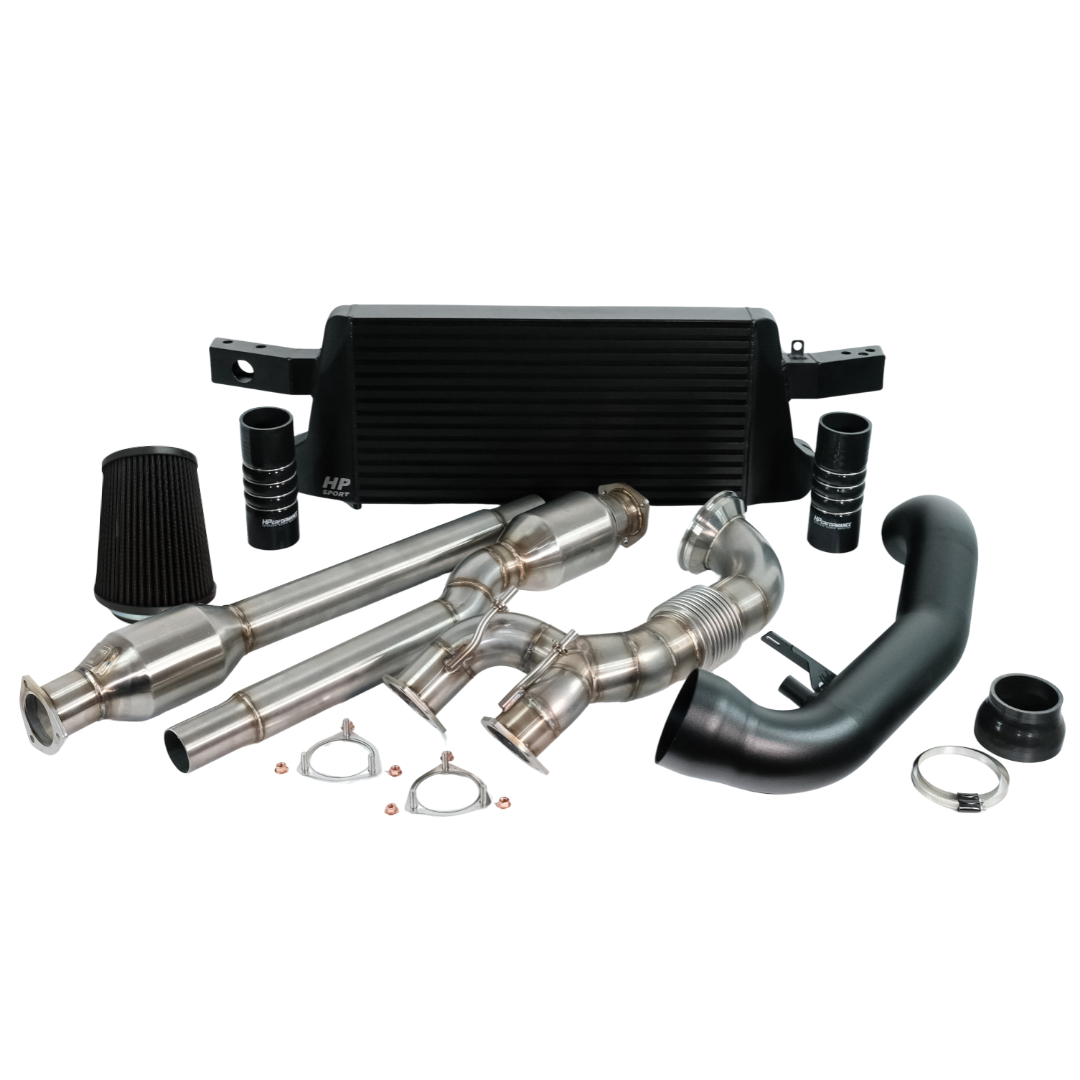 The performance upgrade stage 2 includes reprogramming of the engine and transmission control unit. A replacement plate filter is also used. The intercooler and the intake contribute to the improved intake air temperature in this stage and thus ensure that the power achieved can be reproduced. The additional TÜV downpipe reduces the exhaust backpressure even further, noticeably lowering the exhaust gas temperature and thus achieving a further increase in performance. Furthermore, a before and after measurement on our all-wheel drive test bench is included in the offer.