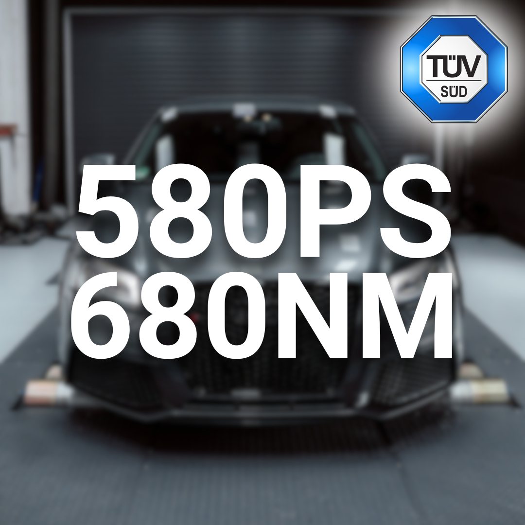 The Performance increase level 4 is the most powerful stage that we offer on a standard engine (without boost). This stage comes with the fresh air and exhaust gas optimization of stage 2, but is supplemented by the turbocharger, spark plugs and a modified 12mm high-pressure fuel pump. The "retrofit" X8 Turbo is used in this stage. This comes from the facelift models with aluminum block and offers even higher power reserves. Thanks to its special exhaust gas turbine profile, the susceptible steel engine is greatly relieved (in terms of exhaust back pressure) and can therefore reach the 580 hp marker without hesitation. The package also includes the tuning of the engine and transmission control unit to our All-wheel drive test bench included.