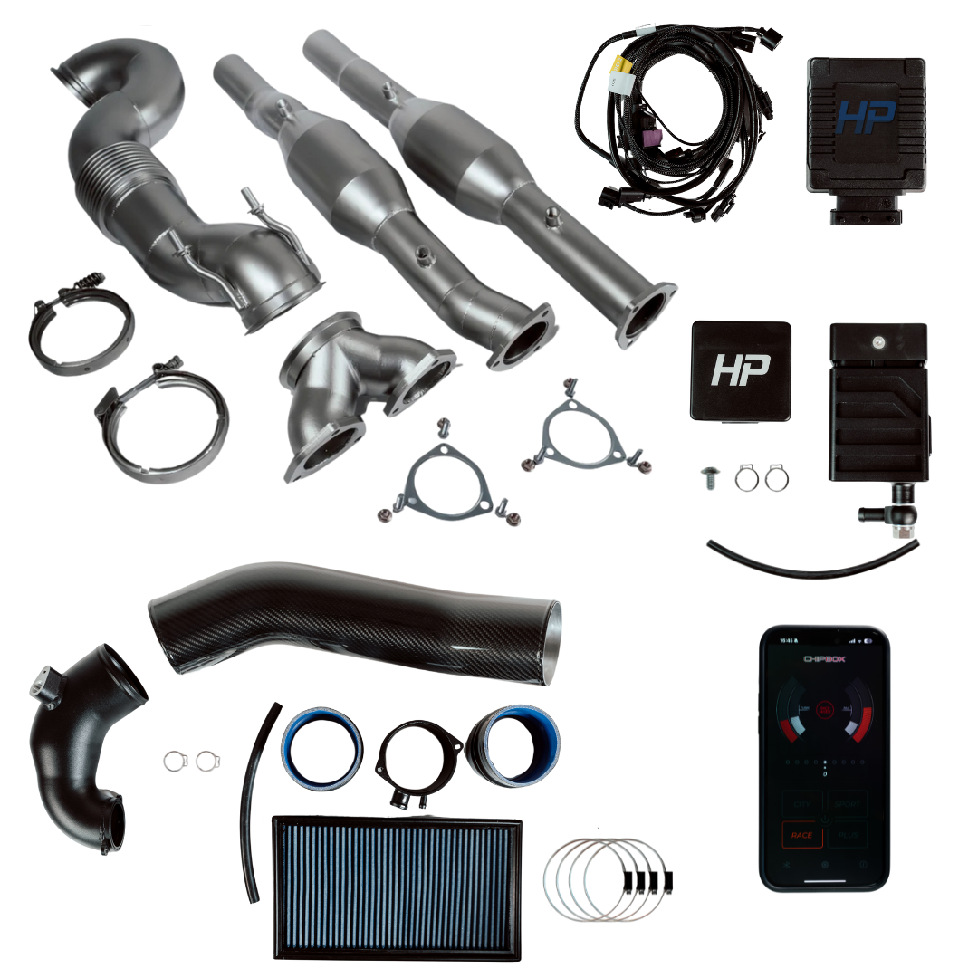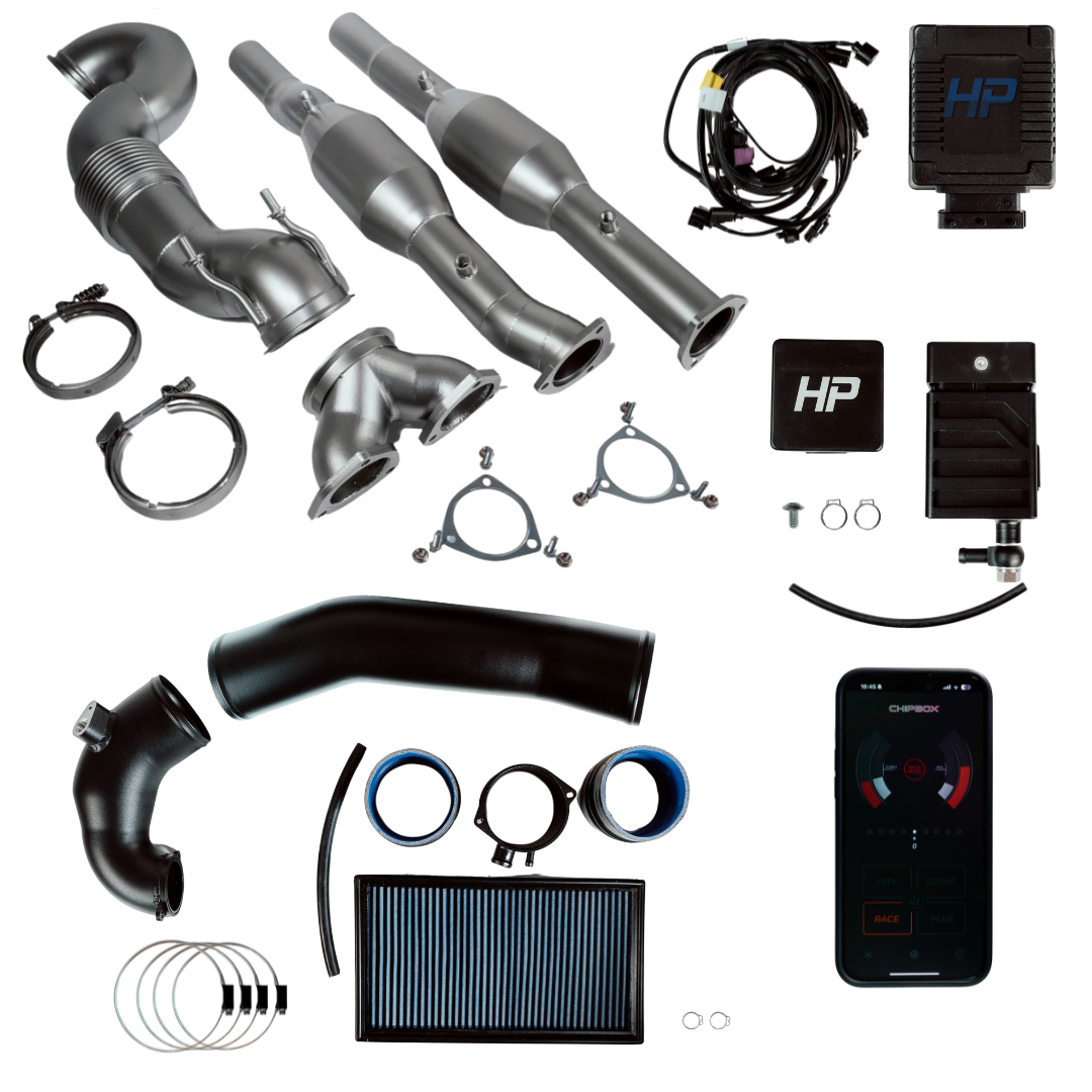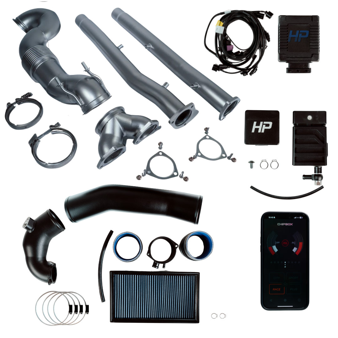 Die Export Leistungssteigerung Stufe 1 beinhaltet neben der HP Chiptuningbox auch einen geänderten 4" Ansaugung inkl. Tauschplattenfilter für verbesserten Luftdurchlass. Unsere 4" 101,6mm Downpipe als 400 Zeller, 100 Zeller oder Catless Variante sorgt nach dem Turbo für ordentlich Durchzug.