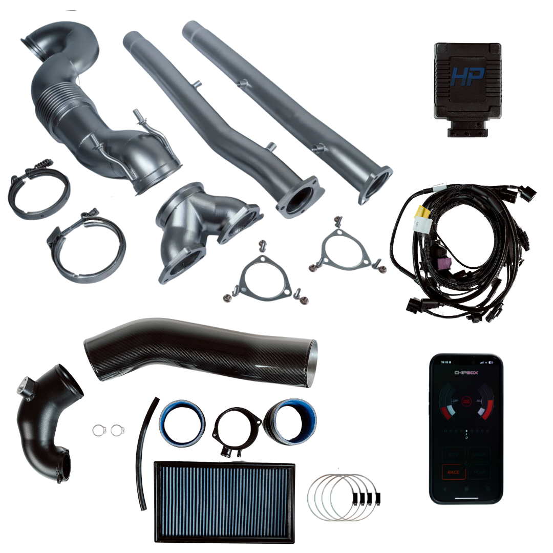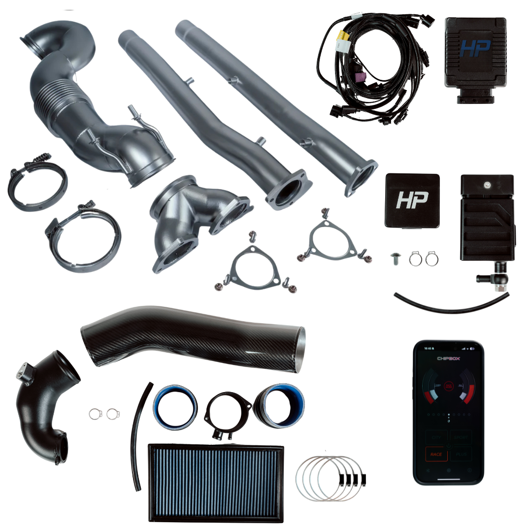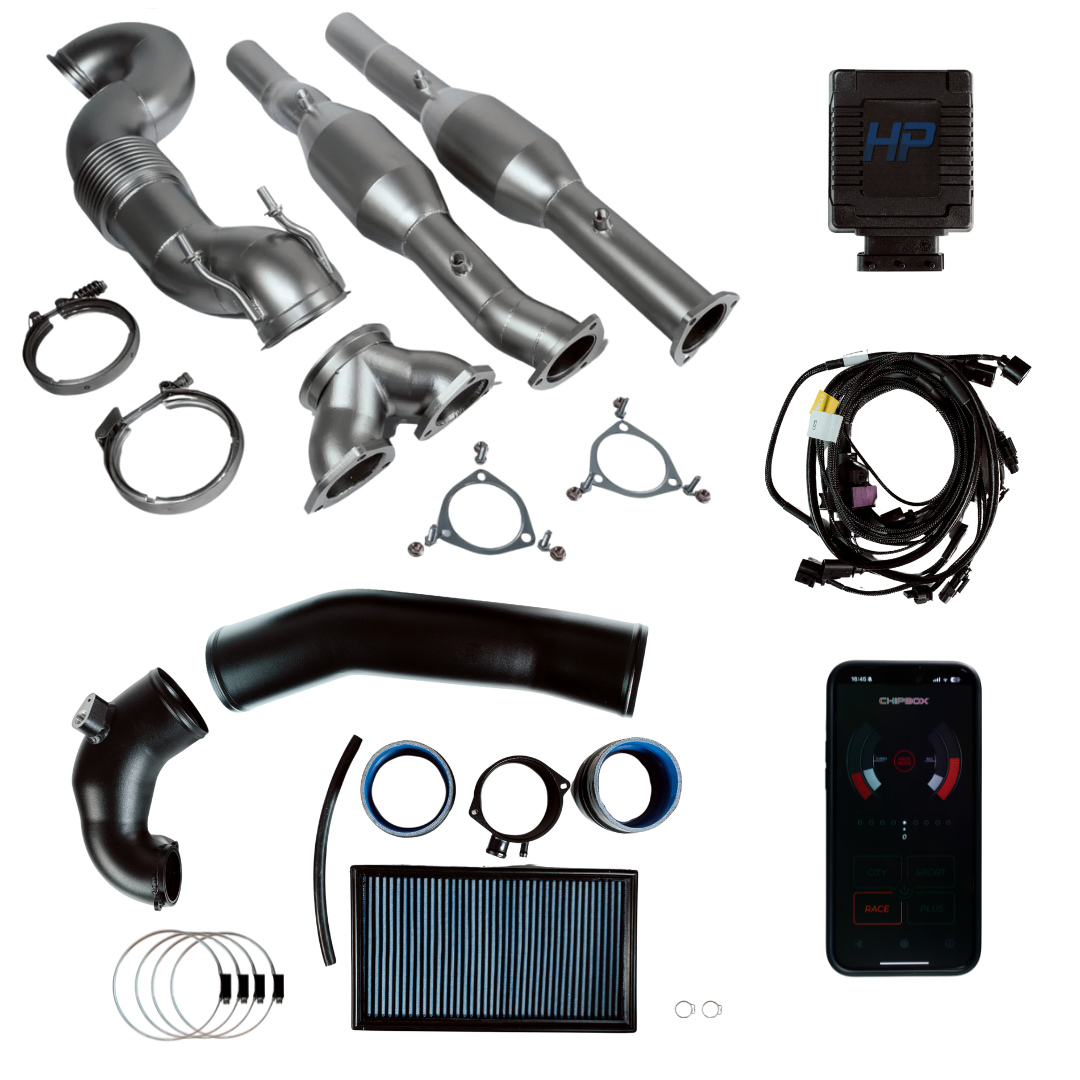 Die Export Leistungssteigerung Stufe 1 beinhaltet neben der HP Chiptuningbox auch einen geänderten 4" Ansaugung inkl. Tauschplattenfilter für verbesserten Luftdurchlass. Unsere 4" 101,6mm Downpipe als 400 Zeller, 100 Zeller oder Catless Variante sorgt nach dem Turbo für ordentlich Durchzug.