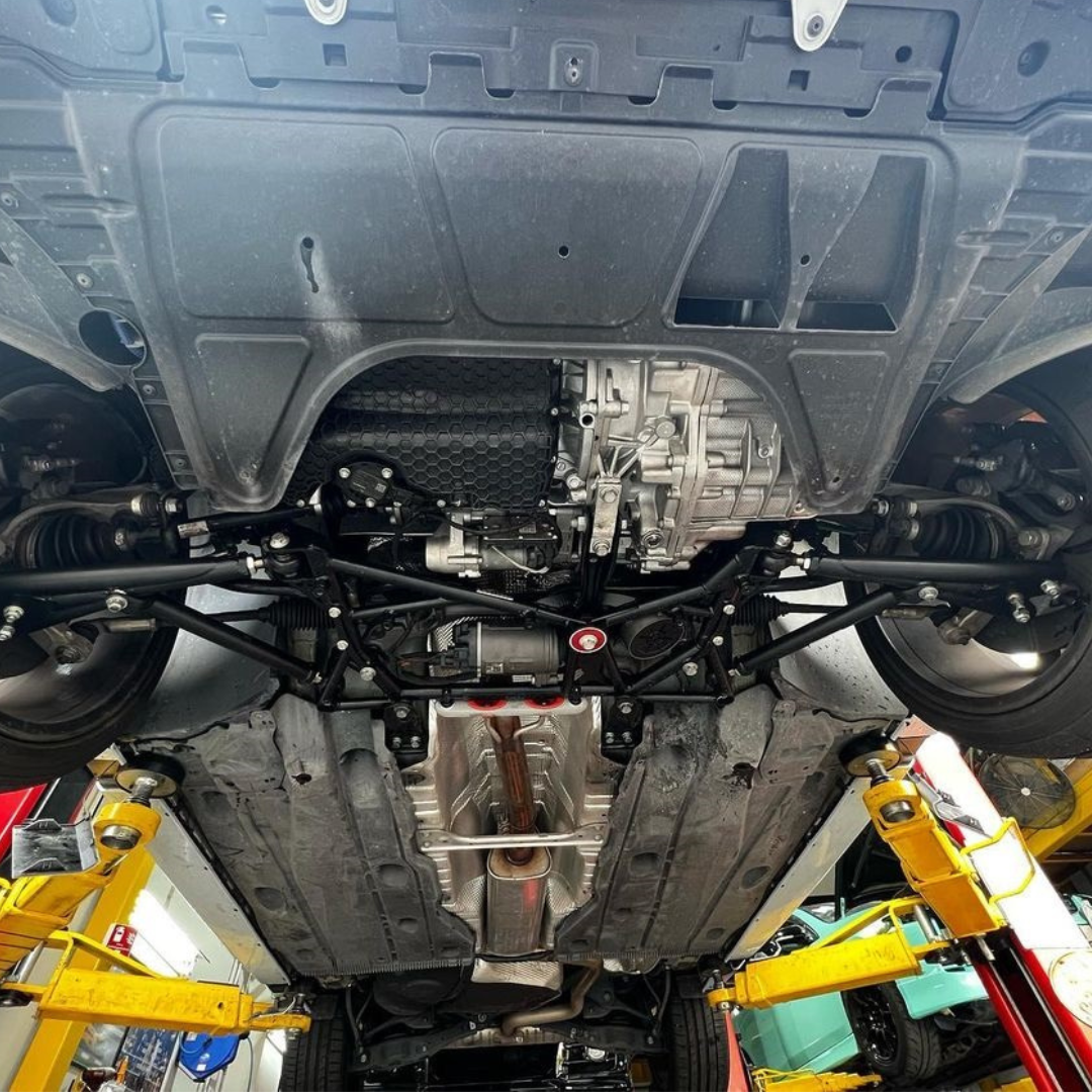 Nous utilisons les mêmes tubes T45 que dans les voitures WRC. Nos bras de suspension offrent une rigidité accrue et des possibilités de réglage supplémentaires. Toutes les pièces d'usine sont vissées sur cette unité, aucune autre modification n'est nécessaire.