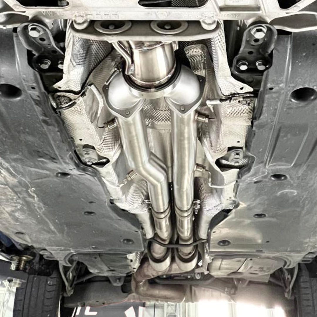 Le downpipe HPerformance 4 pouces 101,6mm sort directement du développement de notre véhicule 1/4 mile pour être prêt à la production. Il s'agit du premier downpipe au monde construit de manière continue dans ce diamètre de tube. Il commence à la sortie du turbocompresseur et remplace ainsi le pré-catalyseur de série. Cette version du downpipe permet une modification/amélioration extrême de la sonorité grâce à l'élimination des catalyseurs et des filtres OPF.