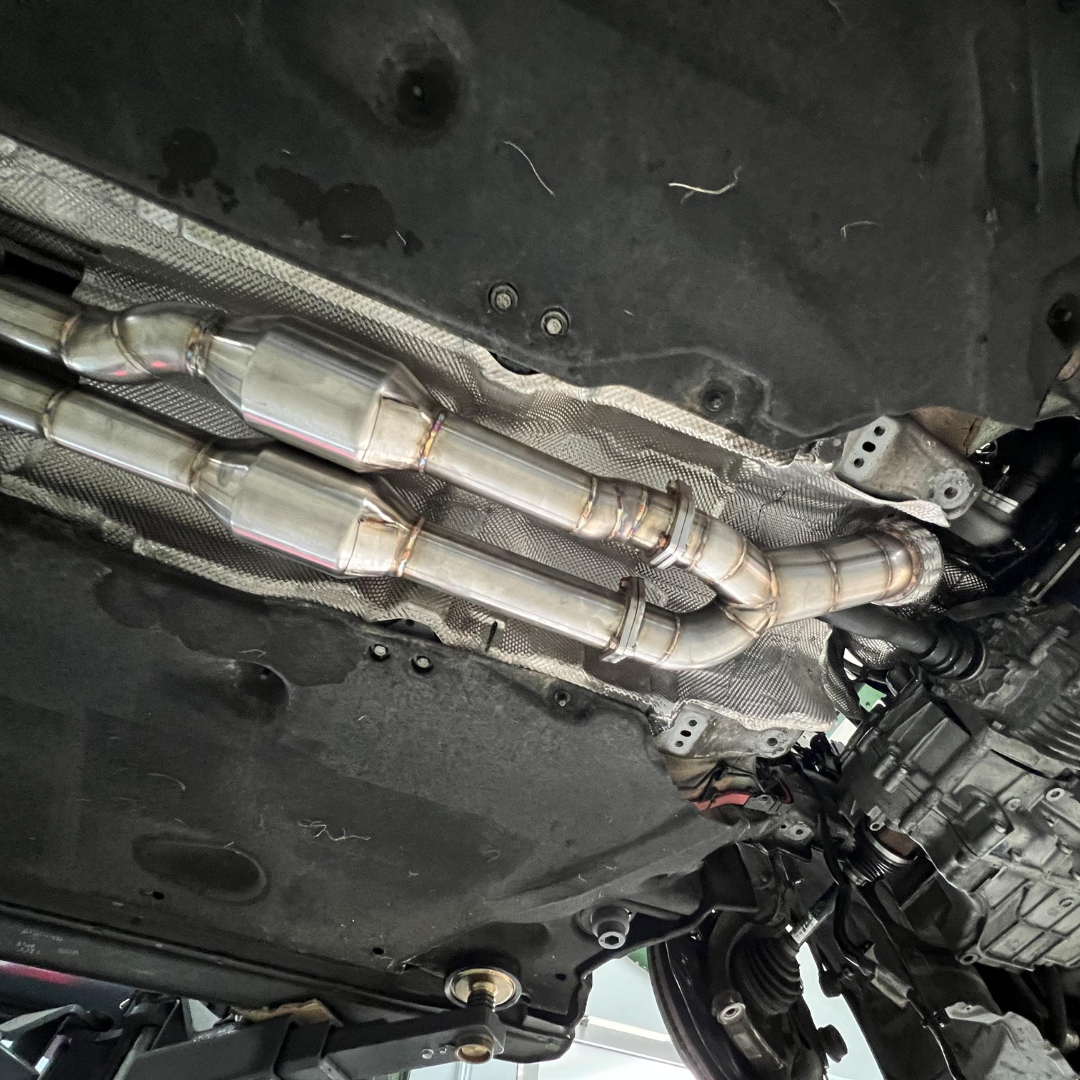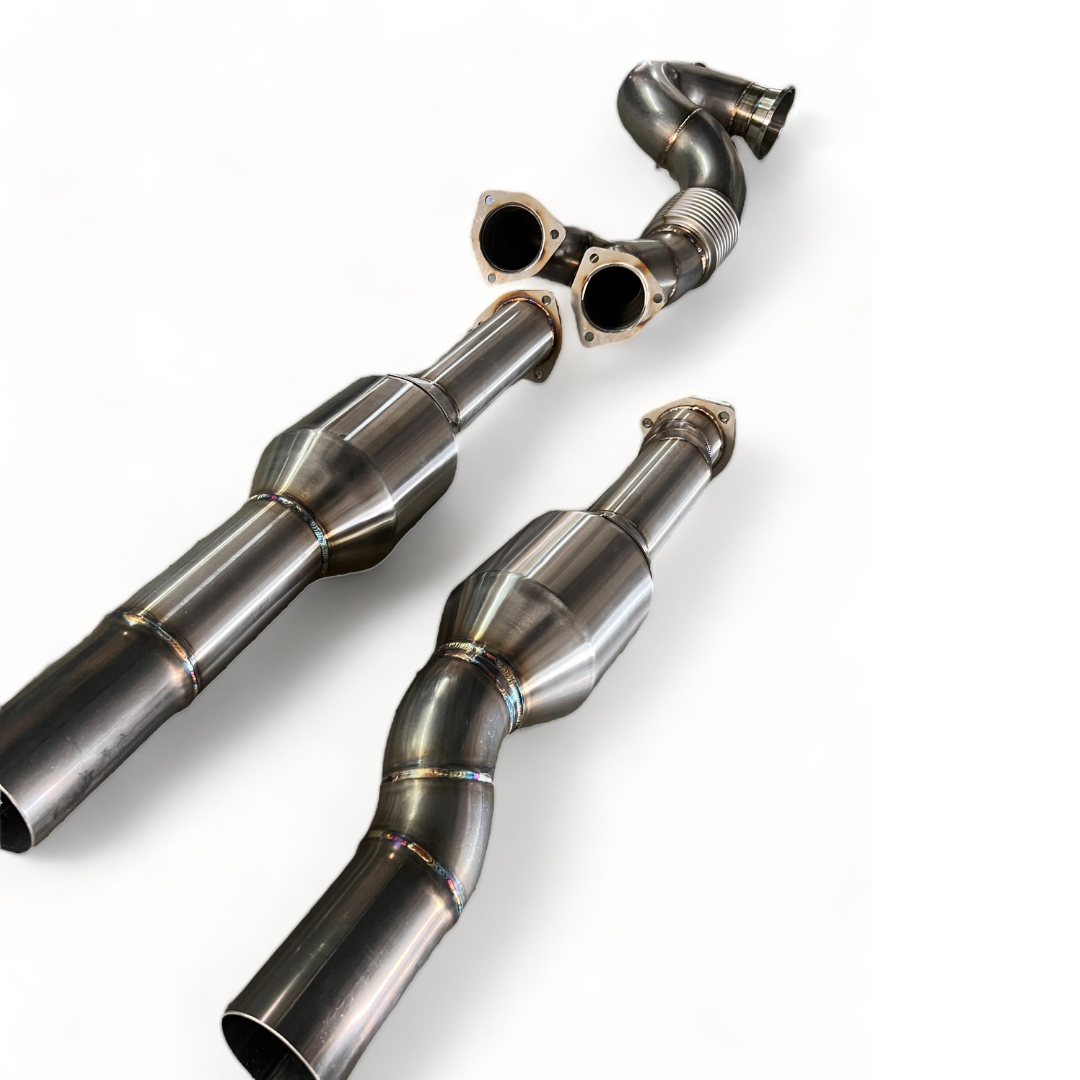 Le downpipe HPerformance 3,5" 90mm remplace le downpipe original. Le downpipe original possède un grand rétrécissement directement sur la bride après la sortie du turbocompresseur. Le catalyseur de série se trouve près du moteur et directement après le turbocompresseur. Dès que le moteur est soumis à une pression de suralimentation plus élevée, il en résulte un volume de gaz d'échappement plus important. Si l'on ne procède pas à une décharge mécanique, cela entraîne une augmentation de la température et de la contre-pression des gaz d'échappement. Le downpipe HPerformance remplace le catalyseur avant de série et dispose soit de 2 x 400 cellules catalytiques, soit de 2 x 100 cellules catalytiques, soit de tubes catalytiques de remplacement qui ne sont plus positionnés après le turbocompresseur, mais sous le véhicule. Cela améliore énormément la thermique et le flux des gaz d'échappement / la contre-pression des gaz d'échappement. En fonction de la réglementation de votre pays et de l'utilisation du downpipe ou du véhicule, vous pouvez choisir entre trois variantes.