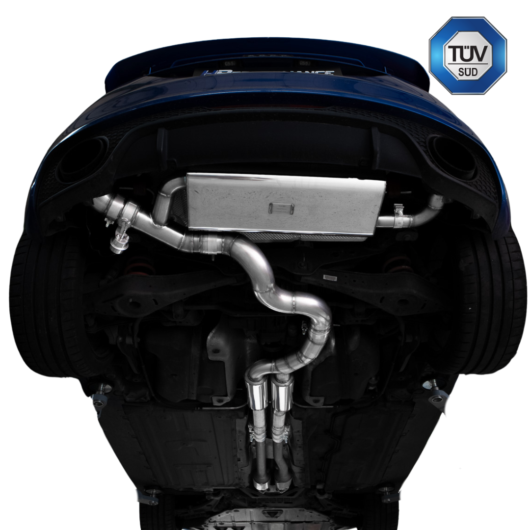 Le système d'échappement 3,5" 90mm est conçu pour des puissances avoisinant les 900 CV et offre en outre un son exceptionnel, sans effet de vrombissement négatif dans la voiture. Le système est livré avec un double tuyau de 2,75" 70mm de diamètre, qui passe ensuite à 3,5" 90mm. Au point le plus étroit / le plus petit, le système d'échappement offre un diamètre de 3,5" 90mm, ce qui permet de gérer 900 chevaux. Il s'agit d'un remplacement plug-and-play par rapport au système d'origine, en utilisant le module de clapet d'échappement d'origine. Par conséquent, le système peut être commandé via les commutateurs AUDI MMI / Dashboad de série (Dynamique / Confort / Individuel / Auto). Le système d'échappement peut être configuré avec ou sans silencieux central. Si vous choisissez l'option "street", le système d'échappement possède des silencieux centraux et le système est homologué pour la circulation routière. La version sans silencieux central "race" a certes un son plus brutal, mais n'a plus d'homologation.