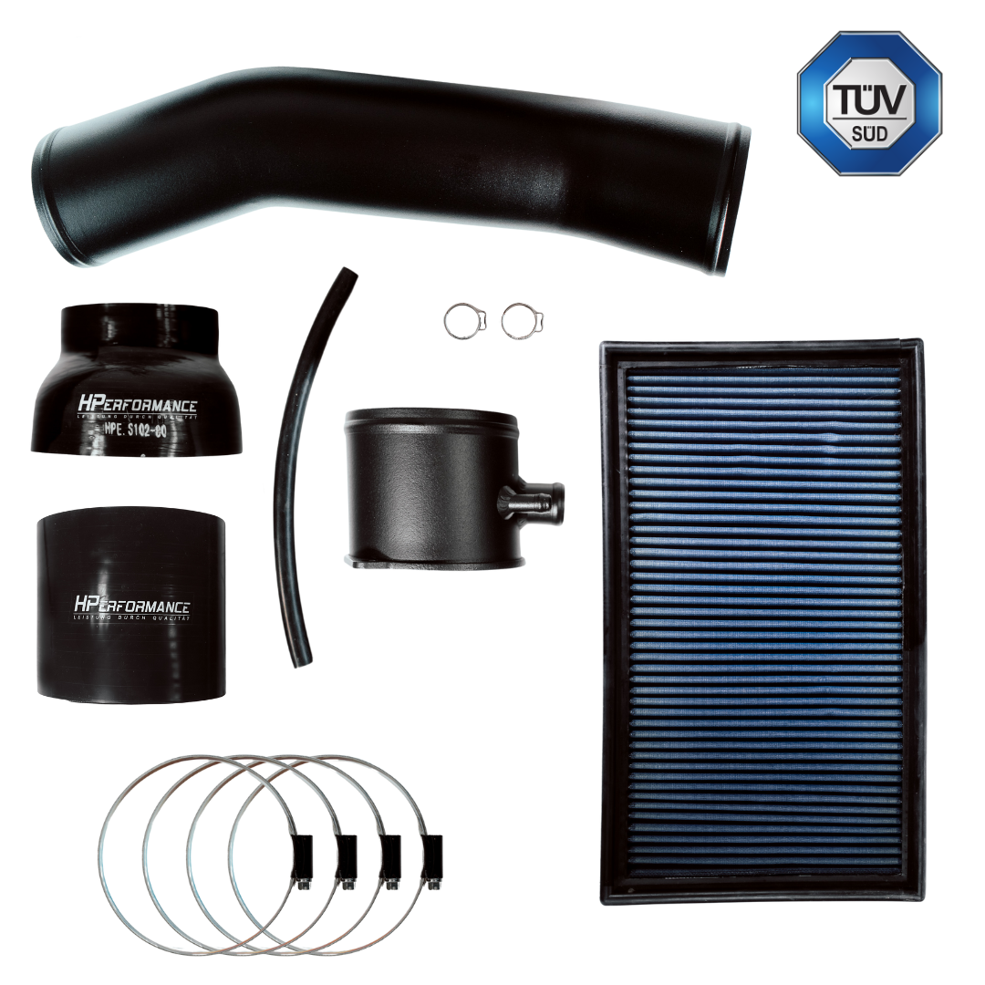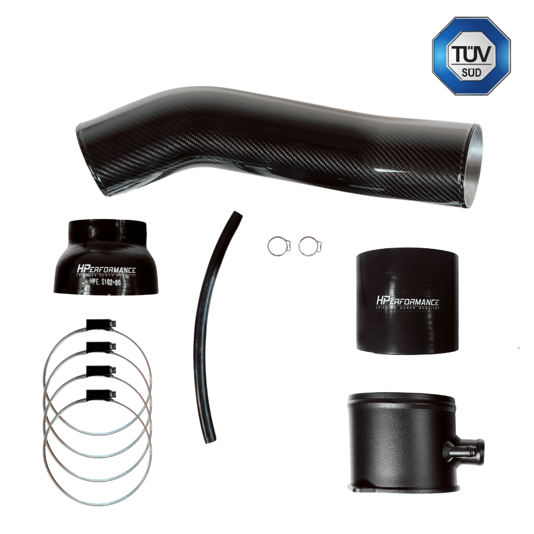 La HPerformance fermée Le système d'admission 4" 100mm est enfin disponible. Il peut être utilisé avec la boîte à air d'origine. Cette variante peut être montée directement sur la turbo-inlet d'origine Plus d'air aspiré sans bruits d'aspiration forts comme avec un système d'aspiration ouvert. Notre système d'admission OEM+ augmente la puissance visible par rapport au système d'admission de série et devrait être utilisé dans tout véhicule de plus de 490 CV. Nous avons renforcé le tube en carbone avec de l'aluminium aux extrémités afin d'éviter qu'il ne se brise lors du serrage des colliers. Le tout est peint avec une peinture spéciale résistante à la chaleur.