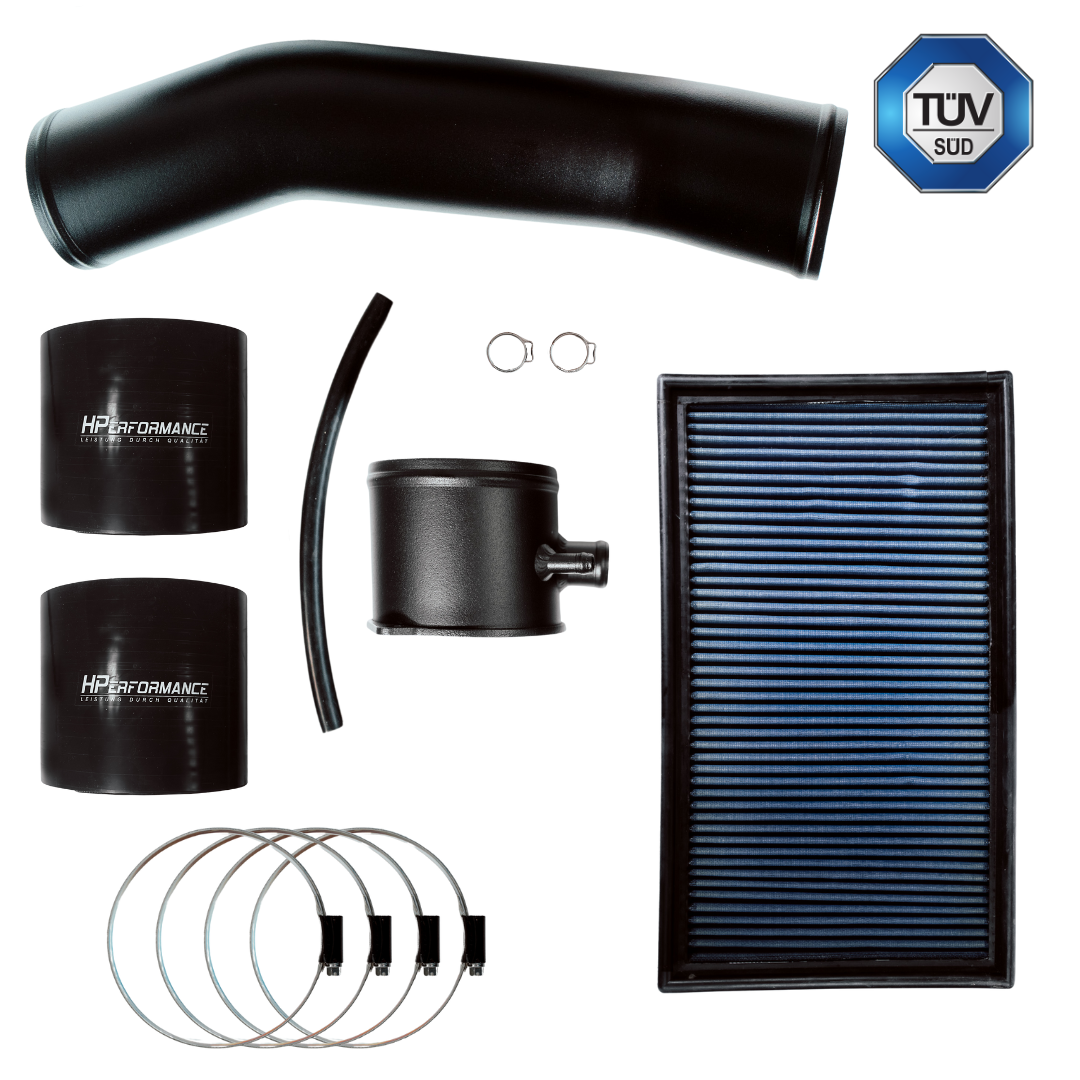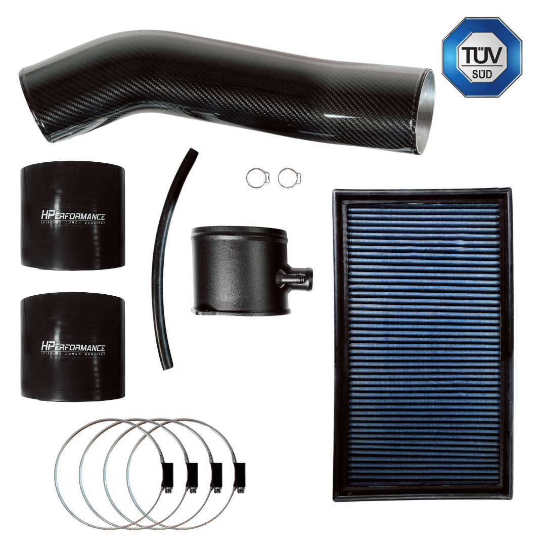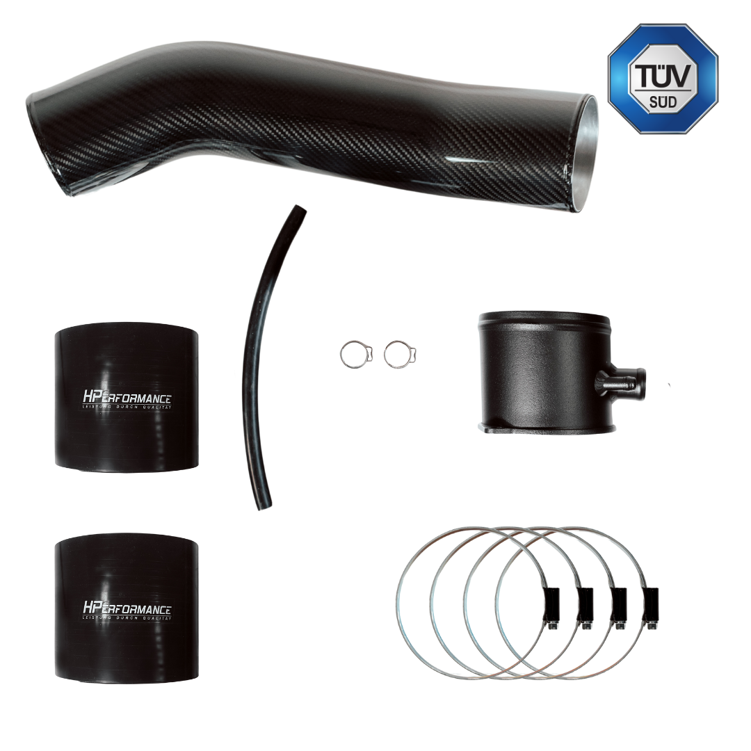 La HPerformance fermée Le système d'admission 4" 100mm est enfin disponible. Il peut être utilisé avec la boîte à air d'origine. Cette variante peut être montée directement sur la turbo-inlet d'origine Plus d'air aspiré sans bruits d'aspiration forts comme avec un système d'aspiration ouvert. Notre système d'admission OEM+ augmente la puissance visible par rapport au système d'admission de série et devrait être utilisé dans tout véhicule de plus de 490 CV. Nous avons renforcé le tube en carbone avec de l'aluminium aux extrémités afin d'éviter qu'il ne se brise lors du serrage des colliers. Le tout est peint avec une peinture spéciale résistante à la chaleur.