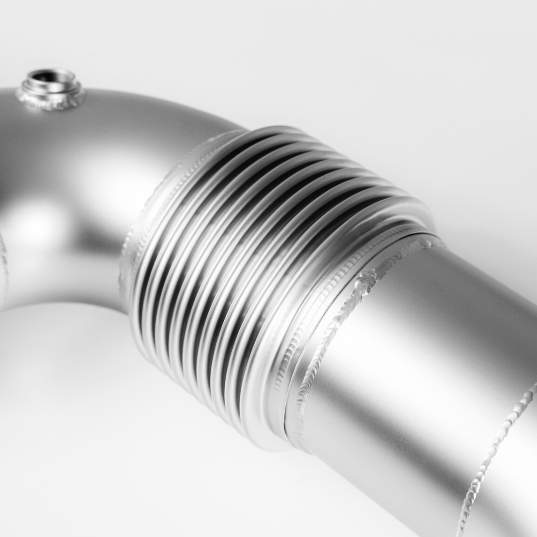 Le downpipe HPerformance 4 pouces 101,6mm vient directement du développement de notre véhicule 1/4 mile à la production en série. Il s'agit du premier downpipe au monde construit de manière continue dans ce diamètre de tube. Il commence à la sortie du turbocompresseur et remplace ainsi le pré-catalyseur de série. Notre downpipe TÜV est équipé de 2 x 400 cellules catalytiques qui peuvent être utilisées bien au-delà de la plage homologuée par le TÜV (600 ch) et utilise en outre des filtres OPF. Nous installons également cette variante dans les niveaux de puissance homologués de 707 ch dans tous les modèles OPF.