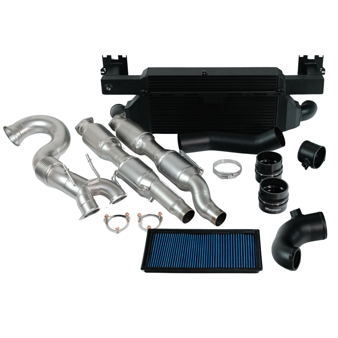Nous atteignons notre niveau 2 de 530 ch et 670 NM grâce à notre downpipe OPF-TÜV de 4 pouces et 101,6 mm, en plus des modifications apportées à l'admission d'air frais avec le turboinlet et le refroidisseur d'air de suralimentation. Les pressions de suralimentation nécessaires pour 530 ch et plus nécessitent une décharge du côté de l'échappement afin de pouvoir fournir la puissance de manière reproductible. Étant donné que les modèles OPF sont particulièrement sensibles à latempérature et à la contre-pression des gaz d'échappement (gaz d'échappement sortant du turbocompresseur et créant un refoulement / une contre-pression dans le système d'échappement), nous utilisons exclusivement notre downpipe 4" 101,6 mm avec modules OPF et catalytique sous le plancher pour ces modèles. Nous obtenons ainsi 0,3 bar de moins en contre-pression que par rapport au 88,9 mm. En plus de l'allègement thermique, le downpipe permet d'obtenir une sonorité rauque et sourde.