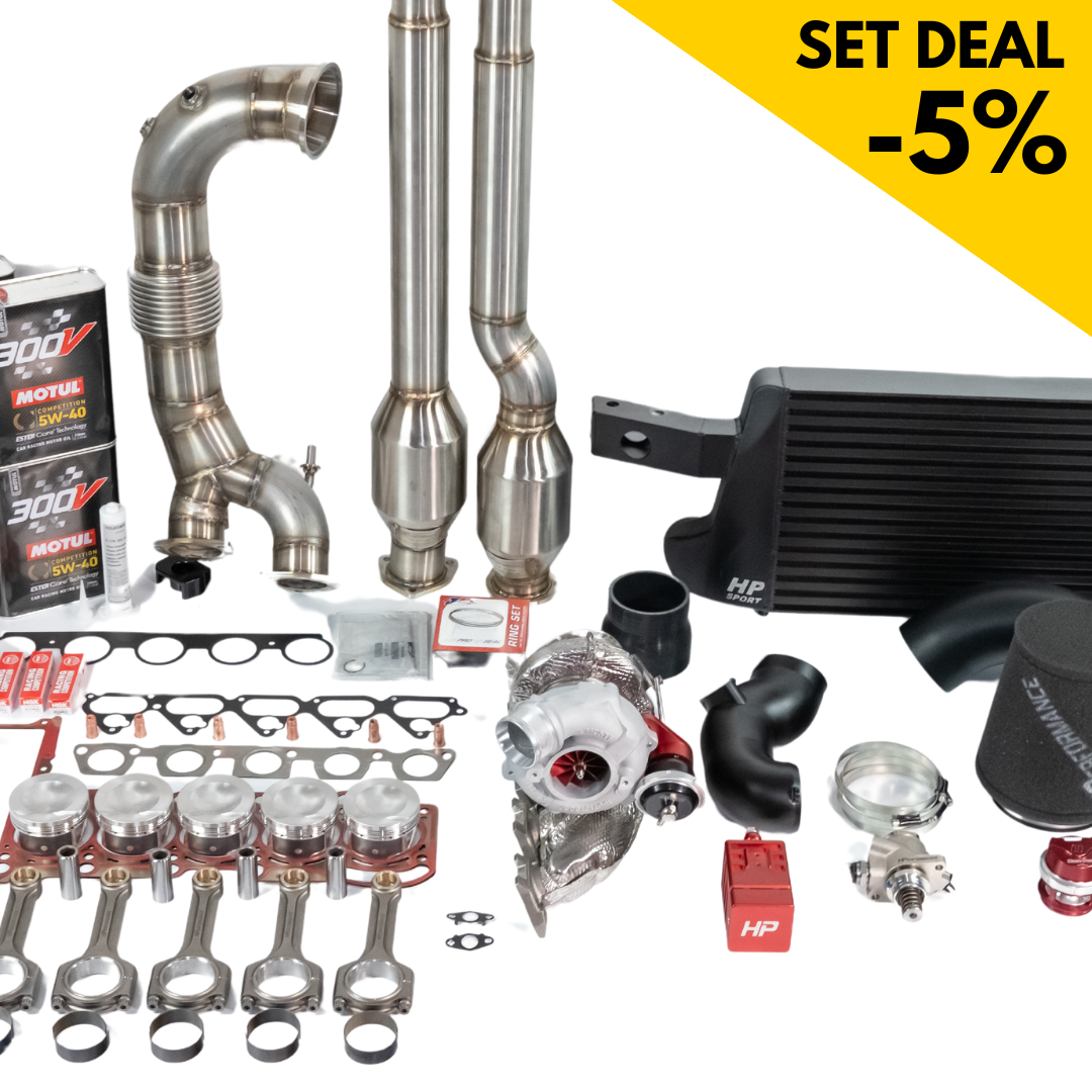Le kit 640PS fournit tous les composants matériels nécessaires pour transformer les modèles TT-RS et RS3 CEP* de série en modèles de 640PS. Il se distingue fondamentalement de tous les kits plus petits par un renforcement du moteur. Les pistons forgés de la série JE Ultra réduisent le taux de compression à 9,5:1 (également possible en surdimensionnement). Il possède, en fonction du modèle, le refroidisseur d'air de suralimentation correspondant pour la décharge thermique de l'air frais ainsi que l'admission et le downpipe correspondants, qui peuvent être achetés au choix sans catalyseurs, avec des catalyseurs à 100 ou 400 cellules. À cela s'ajoute le turbocompresseur "retrofit" du X8, qui peut développer jusqu'à 750 ch sur l'essence et 850 ch sur l'alcool. Le turbo est une pièce neuve. La pompe haute pression de 12 mm nécessaire, un support de couple et le réservoir de catalyseur de la boîte de vitesses sont également inclus.