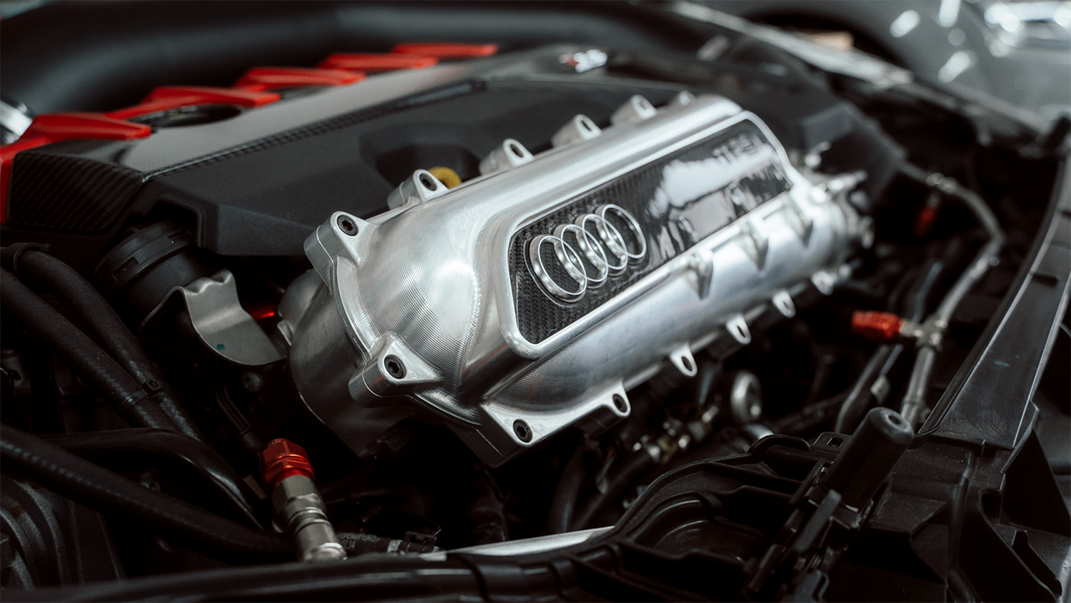 Notre tubulure d'admission à chambre fraisée pour le 2.5 TFSI remplace la tubulure d'admission à fente de série. Les tubulures d'admission à fente sont très efficaces jusqu'à une certaine puissance ou pression de suralimentation, car tous les cylindres sont remplis de manière uniforme. En combinaison avec notre partie inférieure de tubulure d'admission "Runner Delete", l'efficacité est encore nettement améliorée. Cela est dû à la suppression des clapets de turbulence :