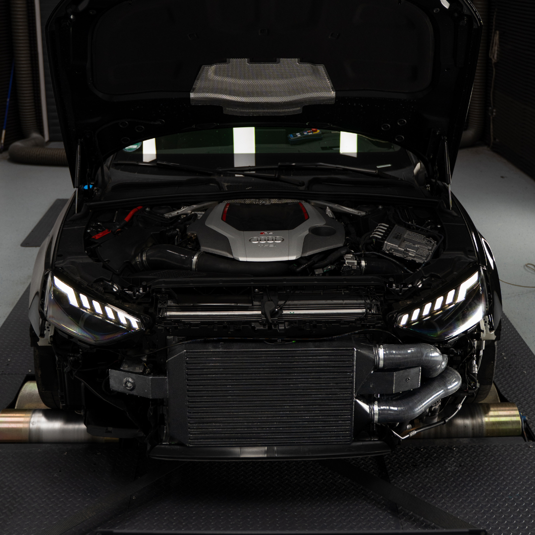 Nous sommes le premier constructeur au monde à avoir éliminé l'un des principaux points faibles de la série de modèles et à avoir créé un produit unique pour cette plate-forme. Les RS4 et RS5 2.9 biturbo sont équipées de série d'un système d'air de suralimentation à eau. Celui-ci est très efficace pour une certaine plage de puissance, mais dès que l'on augmente la puissance, le système se déséquilibre et l'eau fait office d'accumulateur de chaleur. Plus la puissance et donc la pression de suralimentation / le volume d'air augmentent et plus le véhicule est déplacé longtemps sur l'autoroute ou en général à pleine charge, plus la capacité de refroidissement se dégrade. La température de l'air d'admission augmente, le véhicule s'engraisse et la puissance diminue rapidement.