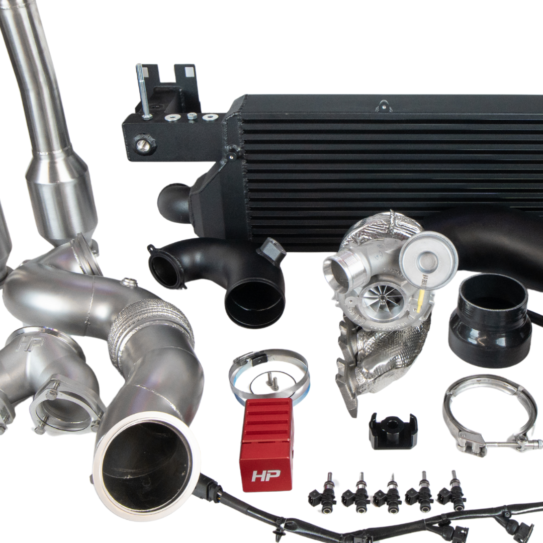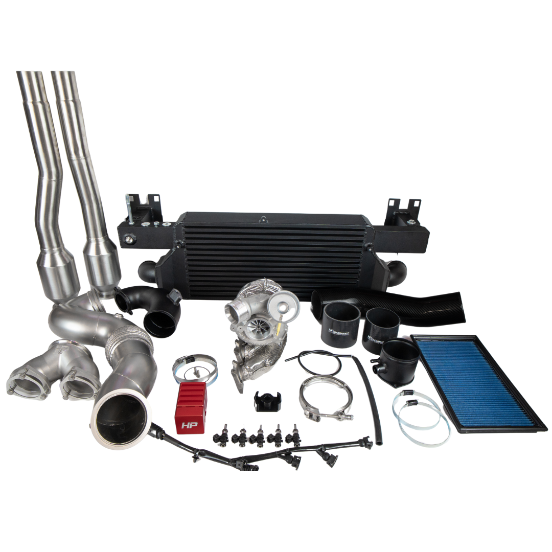 Der großvolumige HP Sport Serie Ladeluftkühler hält die Temperaturen auch unter Vollast stabil, während die HP 4-Zoll-Ansaugung und das HP 4-Zoll-Turboinlet den Motor mit maximaler Frischluft versorgen – für spontanen Ladedruckaufbau und ein deutlich aggressiveres Ansprechverhalten. Die strömungsoptimierte HP 4-Zoll-Downpipe mit TÜV-Unterflurkatalysatoren entlastet die Abgasseite und sorgt für einen klaren, sportlichen Klang. In Kombination mit den größeren Einspritzdüsen inklusive Kabelbaum entsteht ein perfekt abgestimmtes Hochleistungssystem, das den X6-Turbo optimal versorgt.