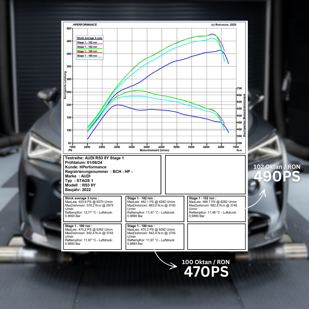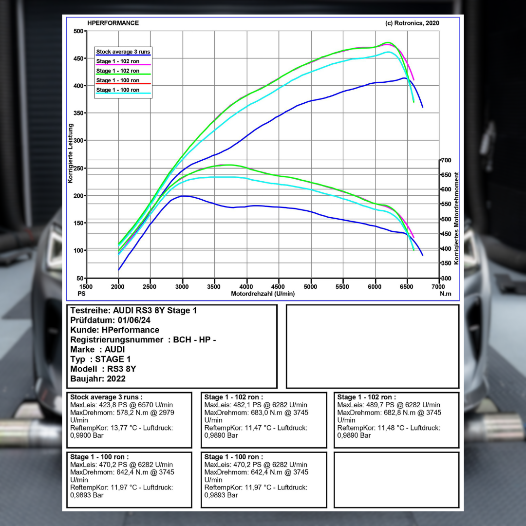 L'augmentation de puissance niveau 1 comprend, outre la reprogrammation de l'appareil de commande du moteur, un filtre à plaques échangeable modifié pour un meilleur passage de l'air. De plus, l'offre comprend une mesure d'entrée et de sortie sur notrebanc d'essai quatre roues motrices , sur lequel nous effectuons le réglage individuel du logiciel moteur, avant de procéder à une mesure sur route.