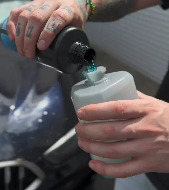 - Dosieren: 100 ml Wax Shampoo auf 10 L warmes Wasser geben und gut aufschäumen