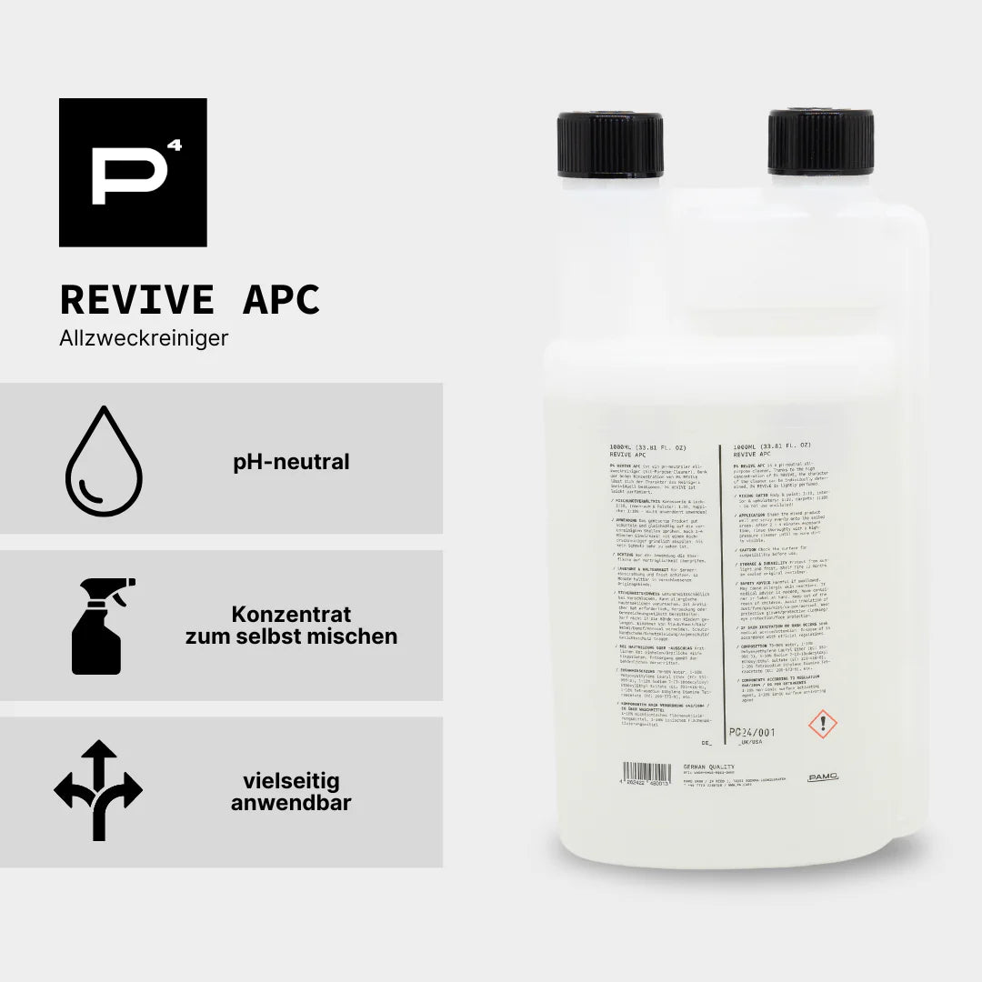 Der P4 Revive APC Allzweckreiniger verleiht Deiner Reinigungsroutine einen frischen Impuls. Dank seiner hohen Konzentration lässt sich der Charakter des Reinigers individuell bestimmen. Überzeuge dich selbst von seiner Vielseitigkeit und nutze den Revive APC für Karosserie, Lack, Innenräume, Polster, Teppiche & vieles mehr! Für dieses Konzentrat wurden ausschließlich hochwertige Rohstoffe verwendet. P4 Revive APC ist leicht parfümiert.