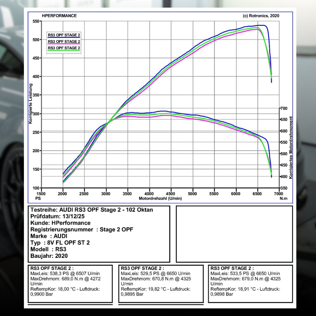 Alle unsere Leistungsstufen werden auf unserem eigenen Leistungsprüfstand und unter real Bedingungen auf der Straße individuell auf Ihr Fahrzeug angepasst