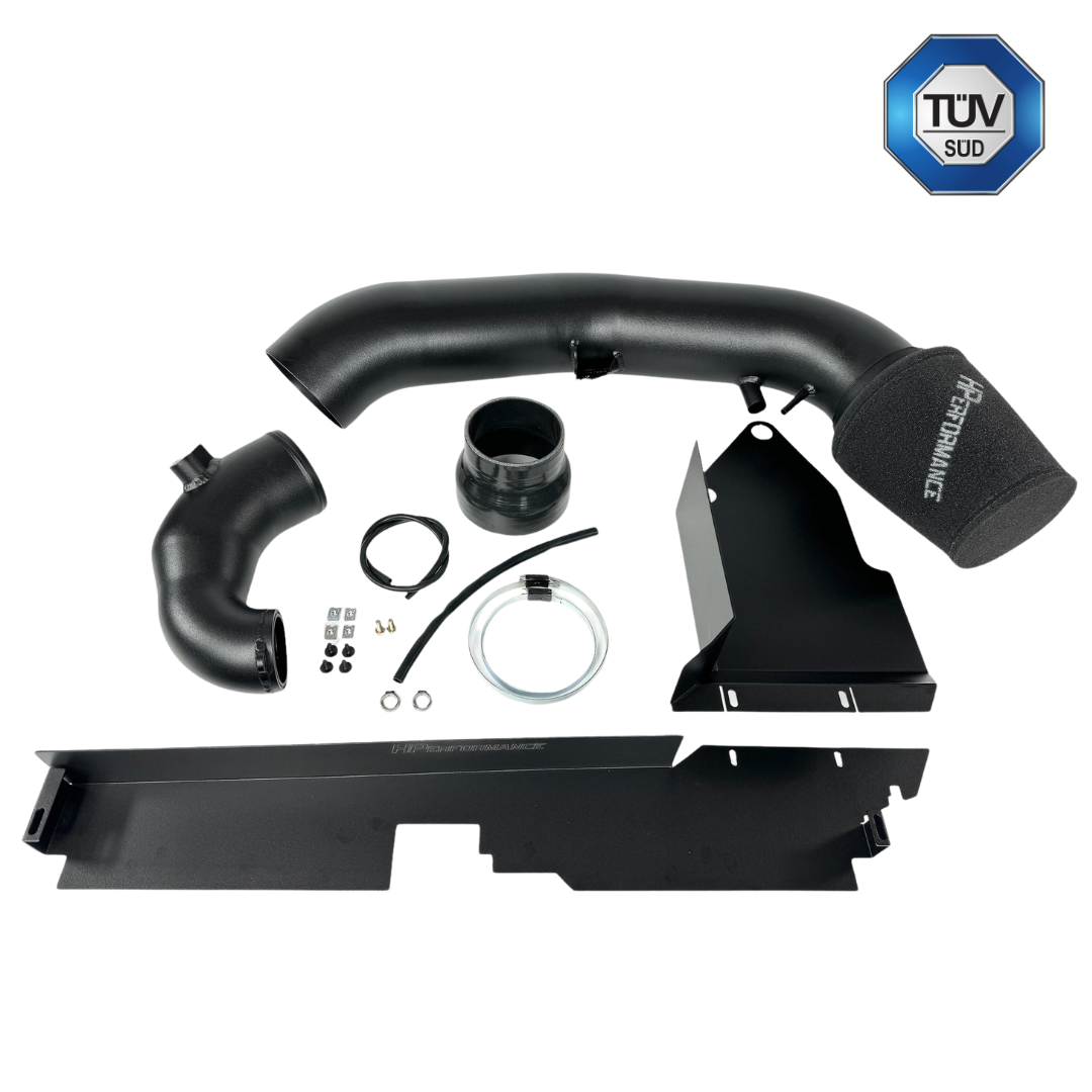 Die Ansaugung wurde komplett neu aufgebaut: mit dem HP 4" Aluminium-Turboinlet, dem passenden HP 4" Aluminium-Ansaugrohr (optional in Carbon) und einer Sportluftfiltereinlage für optimalen Luftdurchsatz.